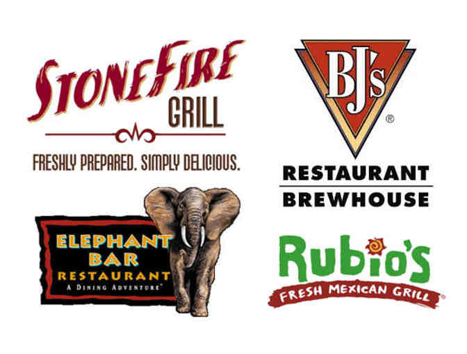 GIFT CARDS - $50 STONEFIRE GRILL + $25 BJ'S + $25 ELEPHANT BAR | $50 RUBIO'S CATERING CERTIFICATE