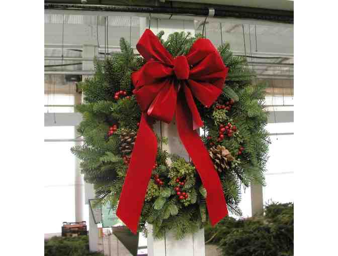 Add some Holiday flare that will welcome guests to a loved one's home - or your own! This festive wreath includes lush, fluffy, and aromatic fresh mixed greenery with cold-tolerant berries, pine cones and a hand-tied velvet bow.