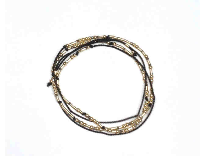 Two 14k gold and silk wrap bracelets spelling out Led Zeppelin's "Thank You" song in morse code dots and dashes. One bracelet spelling out song title: "Thank You," the other spelling out song verse: "When mountains crumble to the sea there would still be you and me."