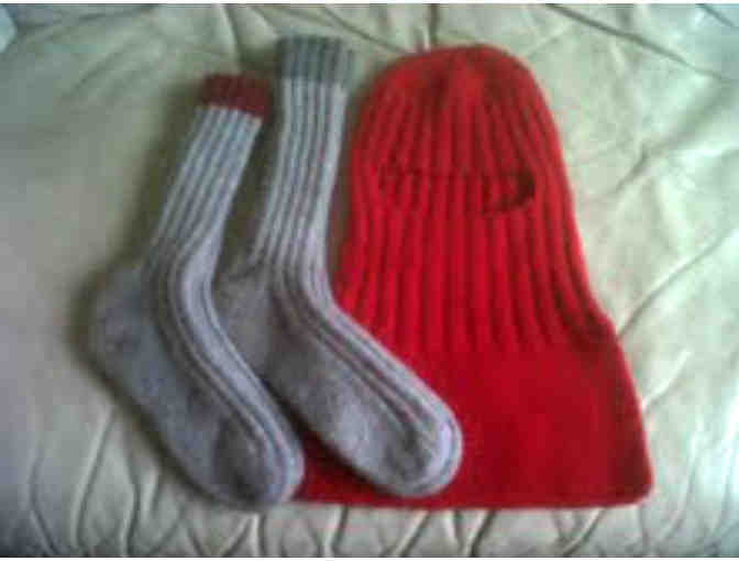 Beautifully hand knit ski mask (or hockey) and matching wool socks. The mask goes below the shoulders for extra warmth in the neck area, so a scarf doesn't have to be worn. It measures 16" from top to bottom, and 12" from top to neck. The soles of the socks are 9".