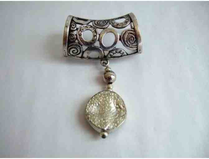 Metal scarf holder with metal circular pendant. Opening measures approximately 3/4".