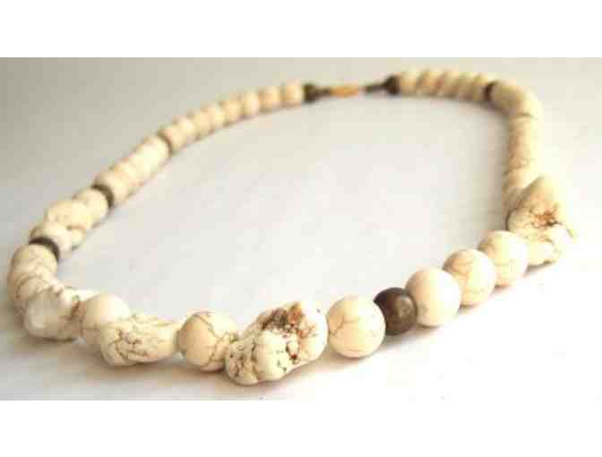 Gorgeous marbled, bone-colored long necklace and matching earrings. Necklace measures 26" and has a strong gold magnetic clasp. Earrings measure approximately 1.5" and have gold hooks.