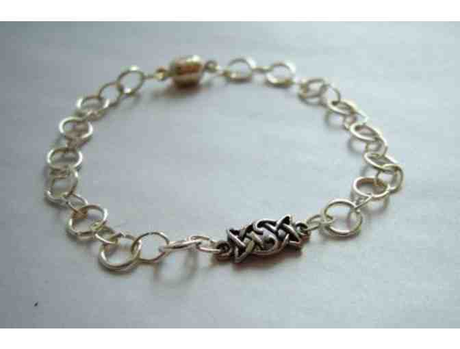 Silver looped chain includes celtic-inspired token in the middle of the bracelet. Measures approximately 7 1/4" and has a strong magnetic clasp.