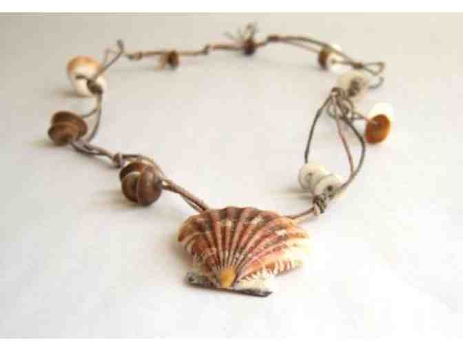 Funky necklace with a collection of shells including large scallop charm. Strung on multi-colored twine. Measures approximately 25" and is made to slide on (no hook closure).