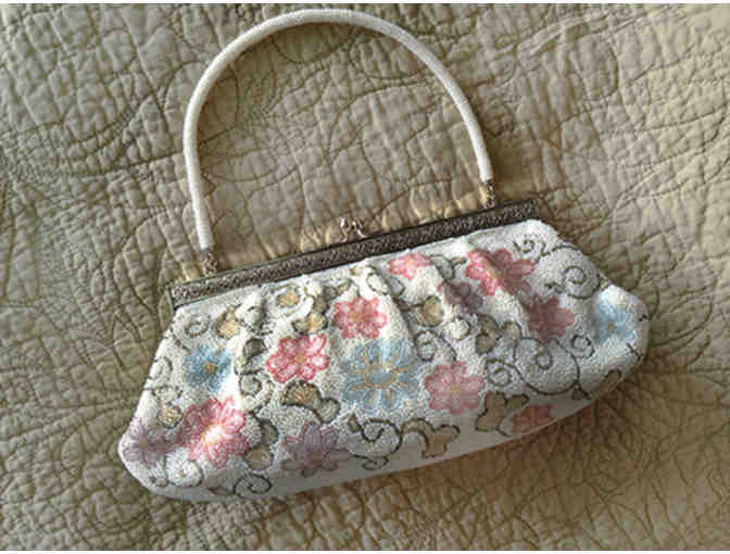 The body of this purse is covered in tiny pearly bright white glass seed beads. This purse has an especially pleasing pastel floral display which gives this purse a wonderful twinkle and adds the perfect amount of glitter. The colors of the flowers include pink, blue, pale yellow/green. The flowers and accompanying floral pattern cover a good portion of the beading and the pattern is different on both sides. Clask closure and beaded handle. Interior of white satin with one pocket with a stain