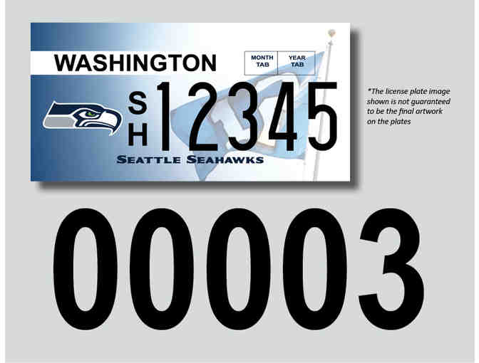 The plate design features the Seahawks logo, an image of the iconic 12th Man flag, and “00003” in black lettering.