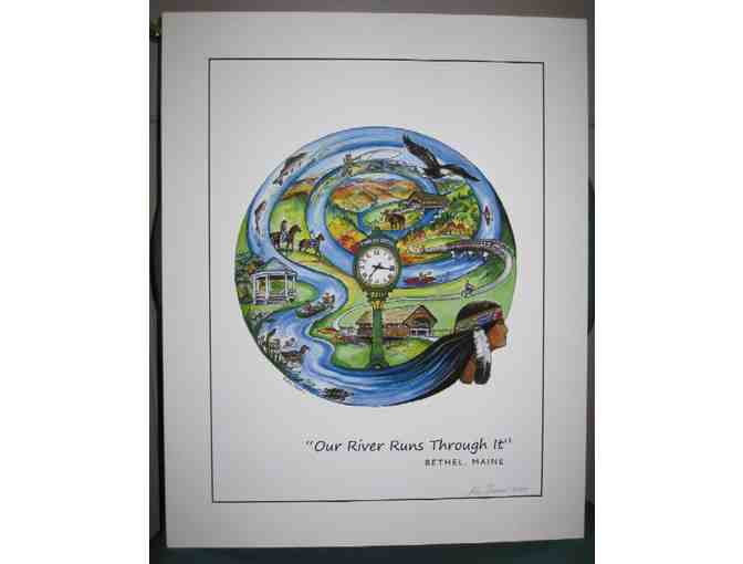 Ken Irons uses local legend, Mollyockett (a Pequawket Indian), her hair morphing into the Androscoggin River, to capture the many Bethel area activities – canoeing, fishing, horseback riding, wildlife viewing, foliage. He also depicts the village clock, gazebo on the common, covered bridges, and more.