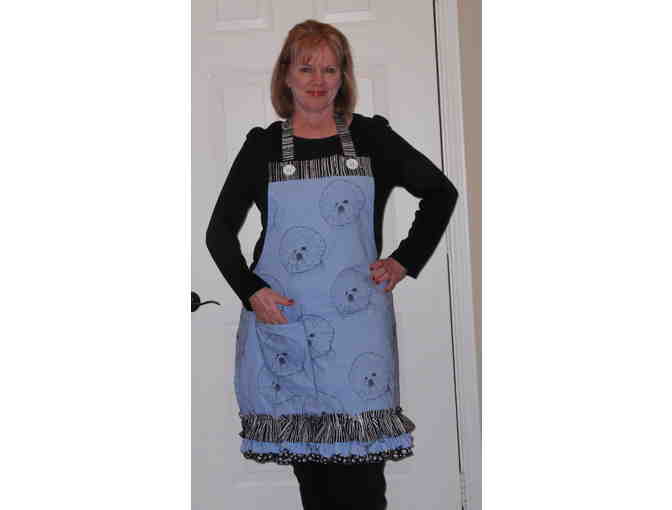 One of a kind Bichon apron with pocket. Ties around neck and waist. Reverse side is black. Machine washable. Picture does not do it justice! Great gift for the Bichon lover! Lovingly made by SPR adopter, Arlene Johnsey.