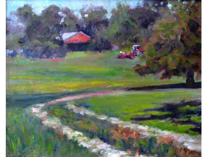 A rich country setting by Carolyn Letvin painted with the fresh quick brush strokes indicative of Plein-air* painting. Oil, Framed 8” x 10”