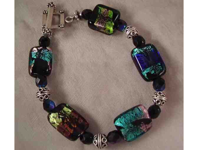 Beautiful glass over silver foil beads in the style of Venetian art glass make this bracelet a jewelry box favorite! Basic black square shaped beads are wrapped in silver then wrapped again with another glass overlay to add interest and tonal shade color to this comfortable beauty. Bali-style findings and czech crystals complement the colors in this bracelet. Matching black glass earrings are sure to become a favorite accessory to coordinate with your wardrobe favorites, both casual and dressy. This enticing jewelry duo incluced a 7.5 inch bracelet and matching earrings. The essence of Deb Rich's artistic expression is revealed in each lampwork bead that she creates in her studio. Deb's beads exhibit her desire to create and inspire change through community outreach. These jewelry pieces are offered exclusively through cMarket to support the fundraising efforts of non-profit organizations. Lampwork glass reflects both the heartfelt passion and interpretative expression of Deb Rich. Her artistic resume includes fantasy sculptures, creatively fashioned from found-objects and recycled materials. Deb's Glass Designs are truly hypnotic, one-of-a-kind pieces that cannot be replicated or manufactured by a machine, so items may differ slightly from photos. Deb only sells jewelry pieces that capture the grace and flow of glass artistry. All jewelry is made with Bali-style findings, Czech or Swarovski crystals, and various complementary beads, making Deb's Glass Designs positively the best choice.