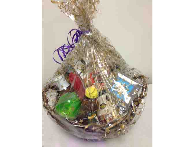 Vermont Products Gift Basket includes Lake Champlain Chocolates, VT Maple Syrup, Maple Grove Farms dressing, Krin's Bakery Pastries, Amy's Granola, Richard's Bar-B-Q sauce, Green Mountain Coffee, kitchen utensils, and more.
