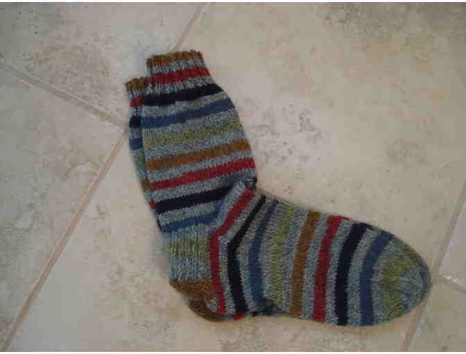 Beautiful hand made wool-blend grey striped socks. Nice length for boots. Great for hiking or outdoor sports. Socks measure 8.5 inches from toe to heel and 8.5 inches from heel to cuff. They have quite a bit of stretch. Fits ladies small-medium or perhaps boys small-medium. Normal wash and dry in machine or hang to dry.