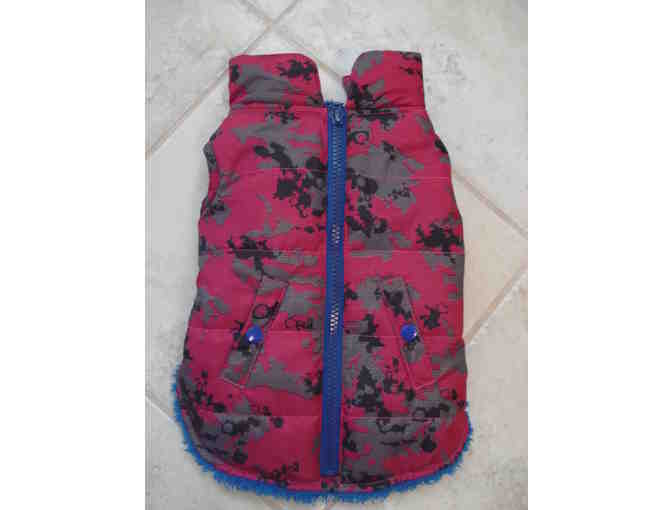 Adorable pink camo print nylon coat for your little gal. Item is in nearly new condition. Size is small. This has probably been worn 1 or 2 times. My fluffs do not like wearing their winter apparel. Time to clear their closet! Pink nylon outer shell. Nice cozy blue lining. Velcro closure on the tummy. Zipper and pocket snaps are only for looks.