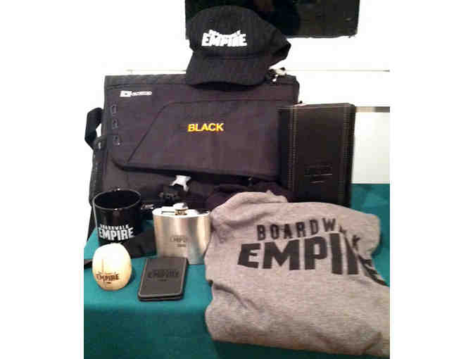 Baseball cap, T-shirt, coffee mug, planner, flask and puzzle.