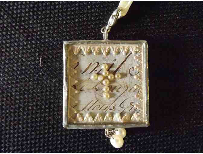 The back of this pendant is 1800s tapestry, while the front is a seed pearl cross on 1800s French paper.  The clasp is sterling silver.