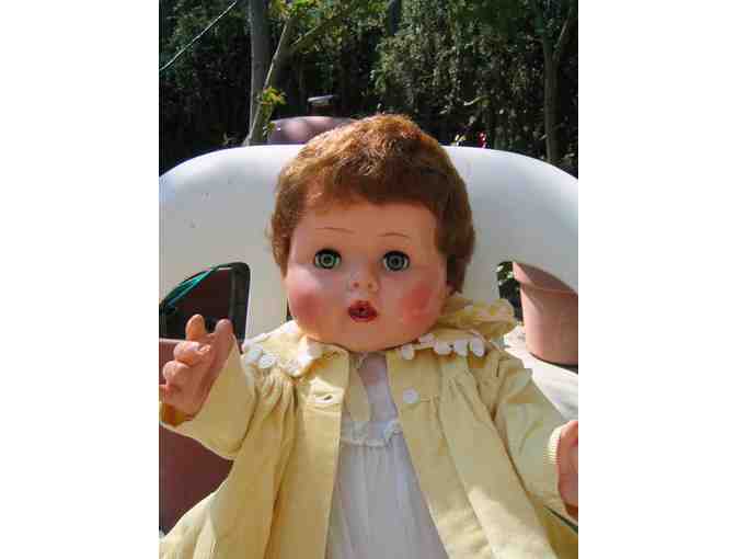 Toodles is a life sized (24" tall) baby doll with jointed elbows and knees, so she can be posed in many positions, including crawling on hands and knees. She is all vinyl, with rooted saran hair, has sleep eyes, drinks and wets.  She is in good "played with" condition, showing a little wear around the mouth.  She is currently dressed in a new romper and booties (not shown), and can wear clothes for 6-9 months-old babies.  The yellow coat and hat in the photo were hand made for her circa 1960.  She is listed in doll reference catalogs at $250-300.