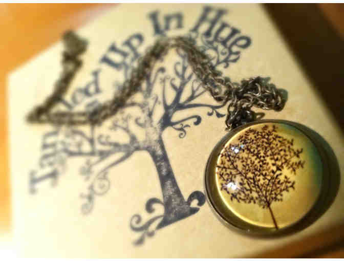 Winning bidder receives two round image necklaces of a tree and bike.  Both are 1.25-inch pendants with glass overlay on an 18-inch brass chain. Includes two brochures good for 50% off on one piece of jewerly from Tangled Up in Hue.