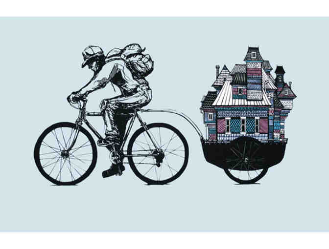 This print is inspired by some of the folks at Dignity Village in Portland and the many others that survive living in Forest Park or in the nooks and crannies of Portland. I have seen many amazing bike carts used to carry everything from scrap metal to full size couches. I've even seen a few carts that people pull around and then sleep in at night. When I got a tour of Dignity Village last year our tour guide was extremely proud of the bike cart he built and used as his main hauling device for all his living needs at Dignity. This image celebrates these inspiring people.