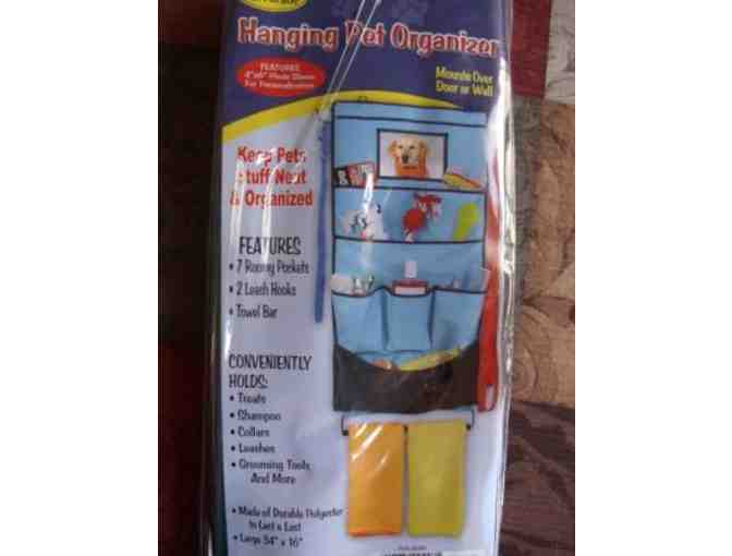 Mounts over door or on wall, measures 34" x 16". Features a slot for 4x6 photo, 2 leash hooks, 7 pockets and towel bar. Great way to organize bath items, toys, snacks, leash, etc.