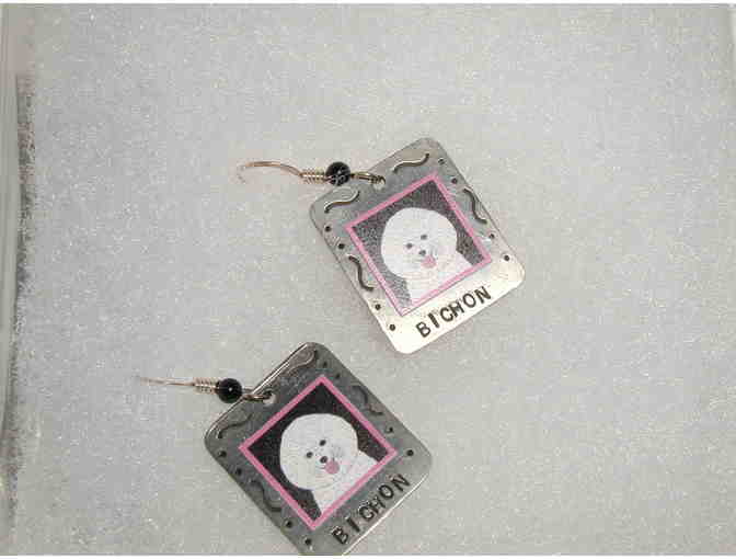 FUNky Stamped Pewter Jewelry by Elvie Zell. Bichon Frise hand painted on pewter wire earrings On reverse of earring is says, "Best in Show". Also comes with adorable Bichon magnet! (mot shown). New in box.