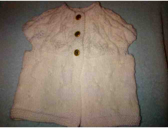 White, sleeveless "leaf yoke cardigan," 15% wool/85% acrylic, size 12-18 months lovingly hand-knitted by one of our members.