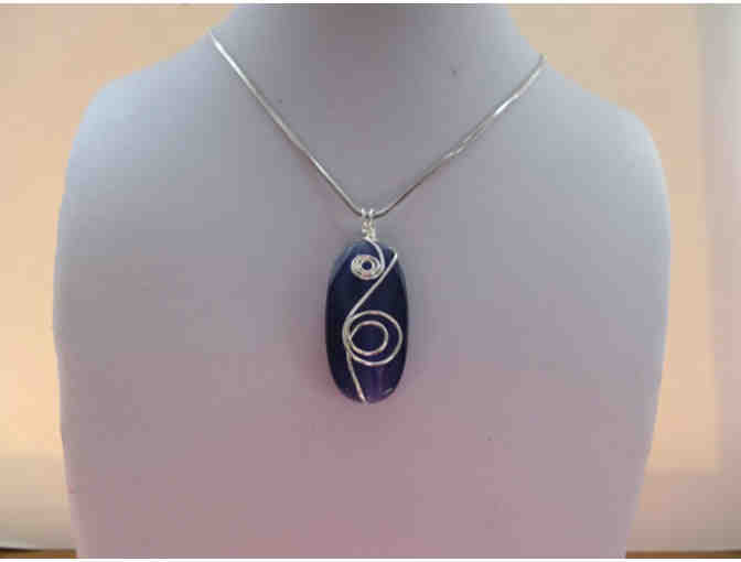 Cat eye bead wire wrapped with non tarnish silver wire the pendant is about 1 1/4", the necklace is 18" snake chain.