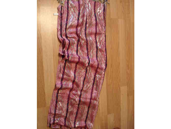 Beautiful unworn pink, purple and silver pasmina type scarf. Extra long 74 inches not counting the fringe and 28 inches wide. Could be used for a bathing suit cover up, evening shawl or great scarf with jeans. Dress up or down!