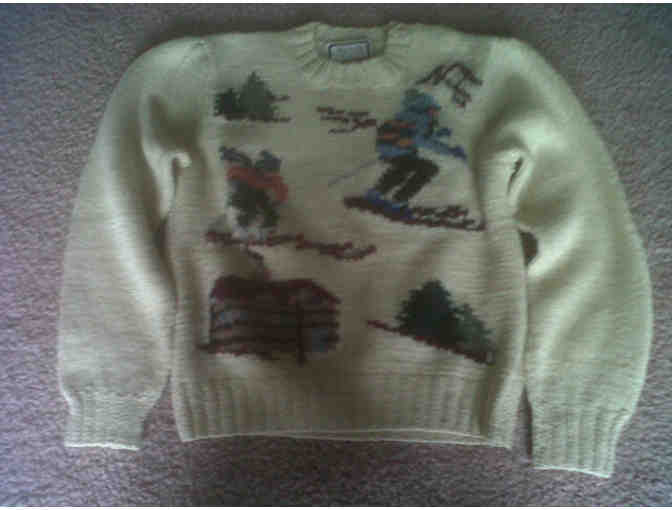 Beautiful sweater with scenes of a skier, trees, and a cabin. It would be perfect for an older child or teen. The size is about a girl's size 12-14, or a ladies size extra-small.