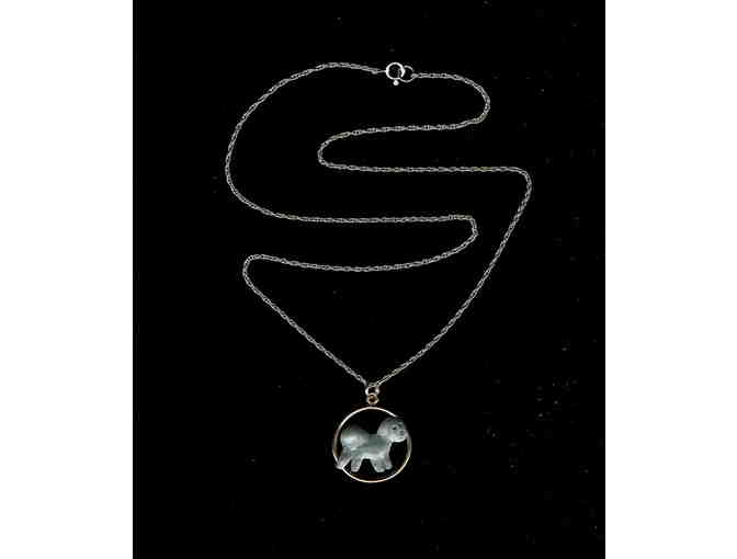 A sterling silver Bichon in a gold-filled circle , with a 20 inch sterling silver rope chain. Handmade by Yvonne Cupolo. Pendant is about 1 inch in size.