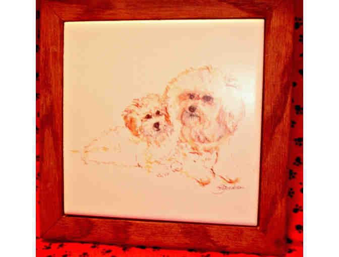 A beautiful Bichon mom & pup on a tile trivet with a wooden frame.