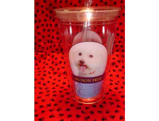 What a great idea...a reusable cup with double wall construction keeps your drink cold while the outside stays dry. The screw on lid seals the edges to prevent drips & mess. But the best thing is the sweet smiley Bichon face on both sides of the cup!