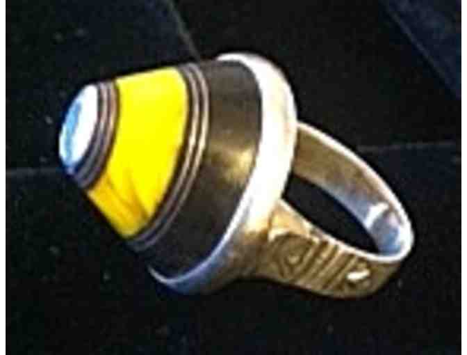 This dramatic conical ring in yellow agate, ebony and silver is naturally elegant, with partially etched band. Size 8.