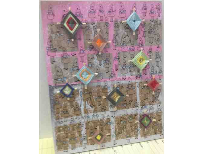 Medium: Paper, spray paint, gouache, ink, acrylic medium, toothpicks, embroidery floss, tacks, hot glue