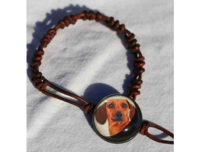 One-of-a-Kind handmade bracelet crafted of brown leather with an adorable red dachshund button for the closure. Bracelet is adjustable and can be sized down to fit a small wrist (or child's wrist).