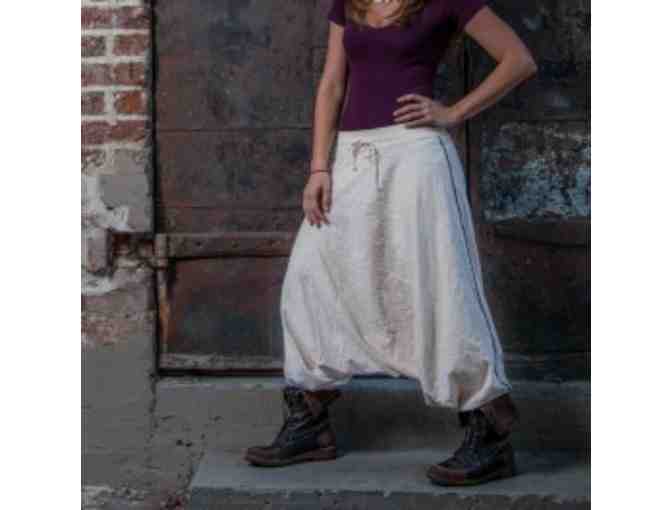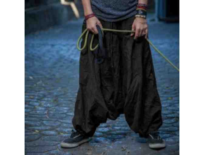 Inspired by a pant from Paris, similar styles of pants are called Indian pants, harem pants, or guru pants. Buddha pants are all of the above plus they fold themselves into their own pocket-bag, making them a perfect travel-ready addition to any wardrobe! They give the illusion of a large triangular skirt but have flexible ankles that can be pulled up on the calf to create different looks.