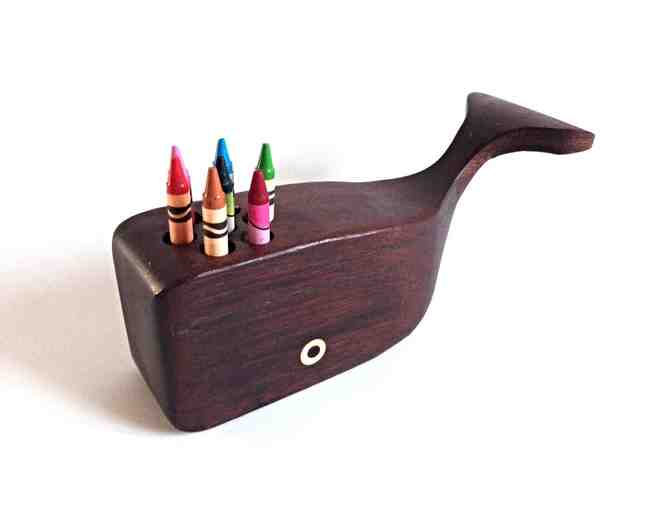 Handmade Wooden Whale Penholder made from Recycled NYC Park Bench (open-eyed)