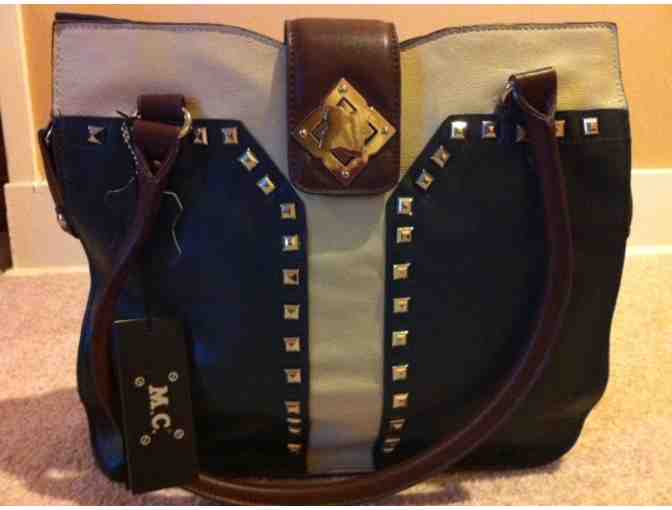 MC Leather Handbag.  This lovely bag is black and brown with light tan accents. Attractive metal details. Zip top closure and with clasp top closure.  Lots of pockets inside for wallet, cell phone, pens, and keys.
