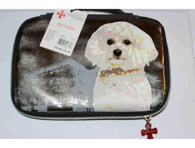 Cute bag for carrying your electronics...it's 9.5" long by 7" high, has a holder on top of the bag and is a must have for a bichon mom or dad...great gift