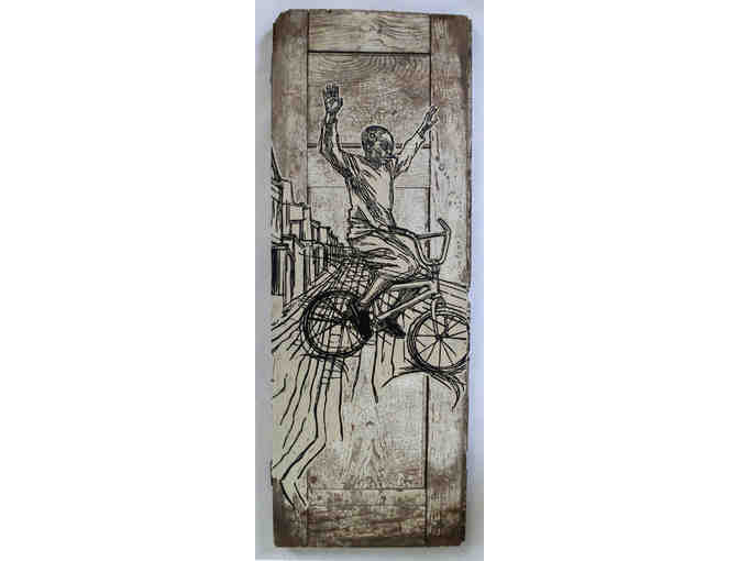 Artist bio: SWOON’s worlds are often populated by realistically rendered-- and evocatively cut-out-- street people, often her friends and family. Riding bikes, talking on a stoop, going grocery shopping-- these people traverse a cityscape of her own unique invention. Bridges, fire escapes, water towers and street signs create crisscrossing shadows and spaces through which her figures move. Inspired by both art historical and folk sources, ranging from German Expressionist wood block prints to Indonesian shadow puppets, SWOON is a master of using cut paper to play with positive and negative space in a conceptually driven exploration of the experience of the streets.