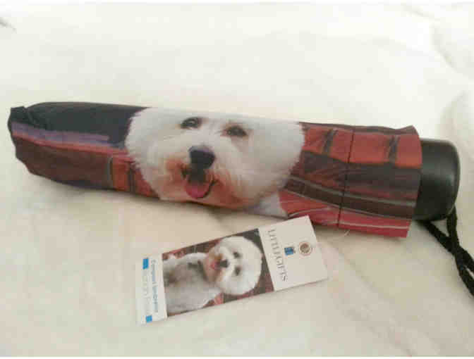 This is a compact umbrella by "Little Gifts". It measures approximately 10" long when closed and opens up to a 38" to 40" Arc. There are black panels alternating with decorated panels of soft dark red, some green and faint mauve as a background with an adorable bichon in the center of each. Manual open and close. New with tags.