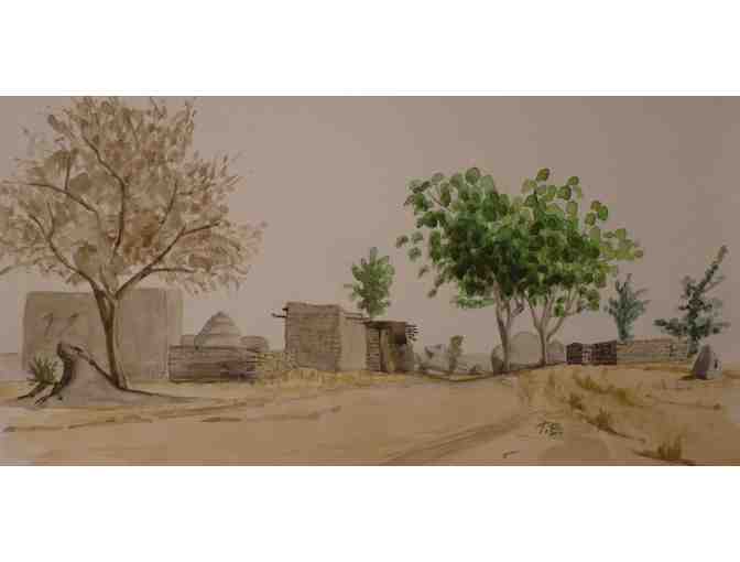 Unframed 8" X 16" watercolor sketch of a Songhai Village in Niger, on an island near Namari Goungou north of Tillaberi by Thomas Berger, 1987. Signed. The watercolor depicts a desert road with typical rectangular clay houses, a cone-shaped clay 'grenier', trees and granite boulders.