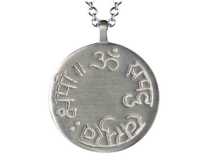 "Indifferent to pain and pleasure, patient and enduring," are inscribed in Sanskrit from the Bhagavad Gita. Silver medallion measures just under 1 inch in diameter and hangs from an adjustable length tan rope necklace. The item comes in a box with a golden bow, that contains the necklace and a red Me & Ro pouch.