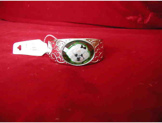 Handpainted Bichon on silvertone hinged bangle bracelet. Bichon is painted on an acrylic faceted faux gemstone. Hinged bracelet is made of plastic.
