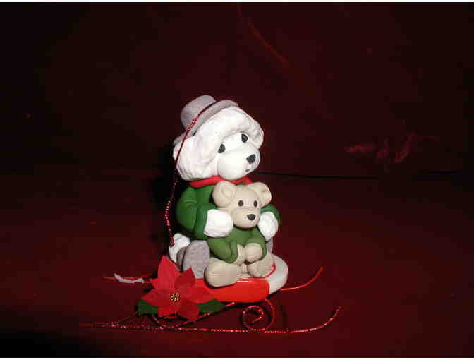 Handsculpted Christmas Bichon on a sled with teddy. Measures 4 1/2" tall. New.