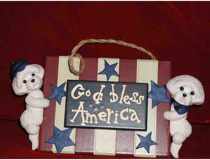 Hand sculpted Bichon "God Bless America" sign. Measures 9"W X 4 1/2"H.