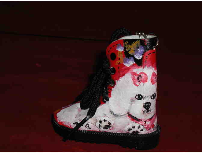 Handpainted Bichon on a red boot key chain. Handpainted bichon has red bows and a red scarf.