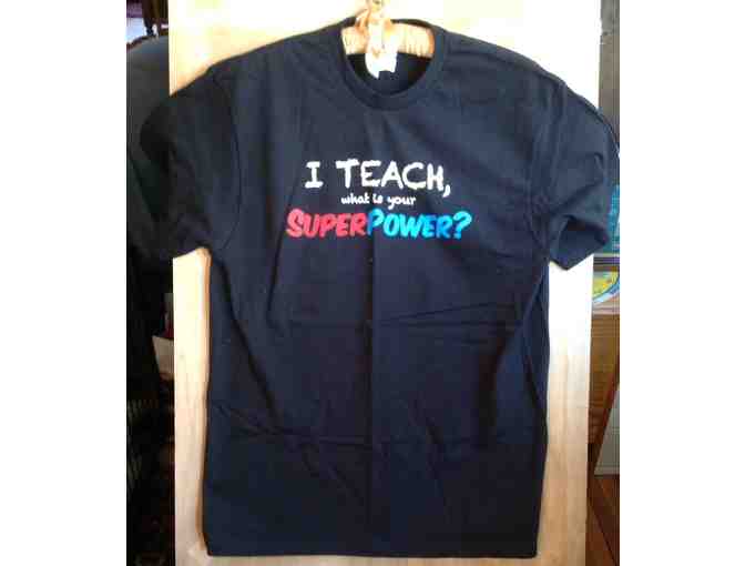 Show a teacher how much you appreciate her! This shirt is 100% preshrunk cotton and is inscribed: I TEACH, what is your Super Power. Size large.