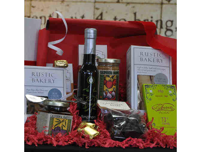 Northern California Artisan Food Collection from Present. A festive ribbon envelopes a gift box of northern California's finest foods topped with keepsake original art by Los Altos artist Jason McHenry. Food items include:  Wild Mushroom & Sage Infused Extra Virgin Olive Oil (200 ml), Organic Savory Shortbread Cheese Coins (5 oz), Sonoma Crafted Olive Tapenade (6 oz), Organic Sourdough Crisp Flatbreads (6 oz), Tomato Balsamic Dijon-Style Mustard (8 oz), Sea Salt Roasted Central Valley Almonds (3.5 oz), L'Amourette Handmade 72% Chocolate Bar (6 oz), Nunes Farms Confectionary Almonds (3 oz), Dark Chocolate Enrobed Biscotti Bites (6 oz), and Chocolate Covered Handmade Carmels (2.5 oz). Plus: Lovely Food-Safe Pewter Spreader Designed and Hand Cast by Sonoma Artisans. Present specializes in Northern Californian made artisan food and gifts for birthdays, welcome baskets, hostess gifts and more. This gift is available in this auction, in our downtown Los Altos store and on presentlosaltos.com.