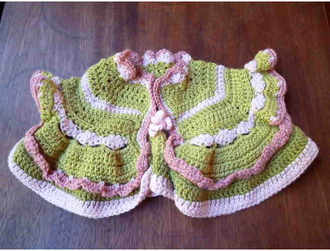 This hand-crocheted sweater is made out of cashmere, merino, microfiber blend. It has the softness of cashmere, the warmth of wool and the strength of nylon so you don't have to worry about wear and tear on the fabric. Size 1T/2T.
