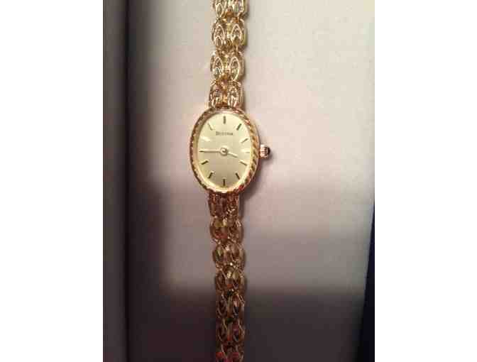 This item is a beautiful Ladies 14 Karat Yellow Gold Bulova Watch, Style  95T33.  Quartz movement. Cabochon crown, moisture resistant.